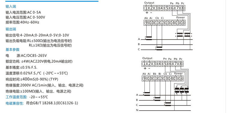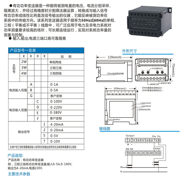 JD204P有功功率變送器輸出范圍:DC4-20mA、0-20mA、0-5V、0-10V等用戶需