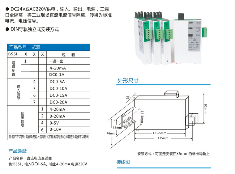 BS5I直流電流變送器將直流電壓、電流轉換成標準過程模擬量變送信號。 DC0-1A。0-5A,0-10A轉4-20mA/0-10V/0-5V/1-5V,用于DCS對電動機、泵或熱網的中央監(jiān)控,監(jiān)視供電線路及其電流。