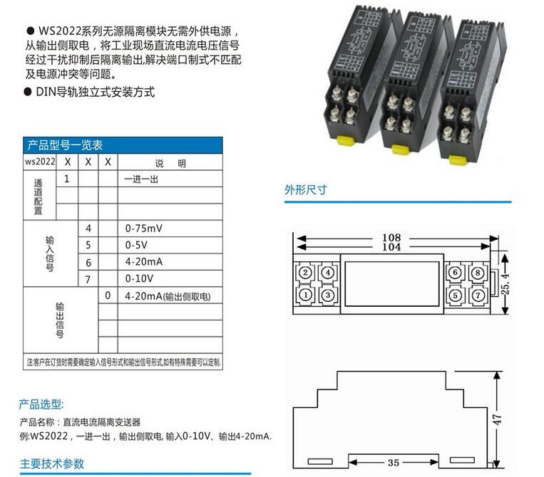 WS2022系列無源隔離模塊,無需外供電源,從輸出側取電,將工業(yè)現(xiàn)場的直流電流電壓信號,經過干擾抑制后隔離輸出,解決端口制式不匹配及電源沖突等問題,DIN導軌式安裝。