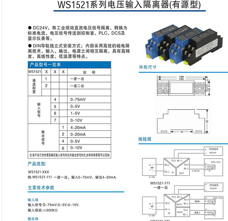 WS1521信號隔離 輸入范圍:模擬量信號 DC4-20mA、0-20mA、0-10V、0-5V、0-75mv、等