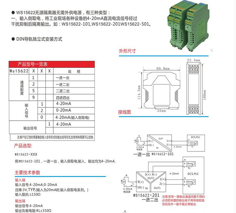 WS15622無(wú)源信號(hào)隔離器,全隔離信號(hào)隔離器,將輸入的四路信號(hào)隔離輸出,無(wú)需外接電源可正常工作,輸入輸出隔離,傳輸精度高,標(biāo)準(zhǔn)DIN T型導(dǎo)軌安裝