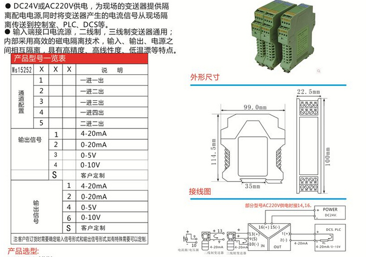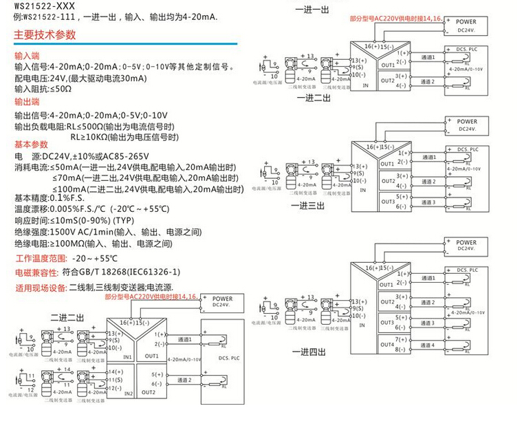 WS21522全隔離雙輸出信號(hào)分配器,轉(zhuǎn)換模塊,mv、V、mA將輸入信號(hào)變換為兩路相互隔離的信號(hào),低功耗,低熱量,低漂移,DIN T型導(dǎo)軌安裝,接線端子可插拔