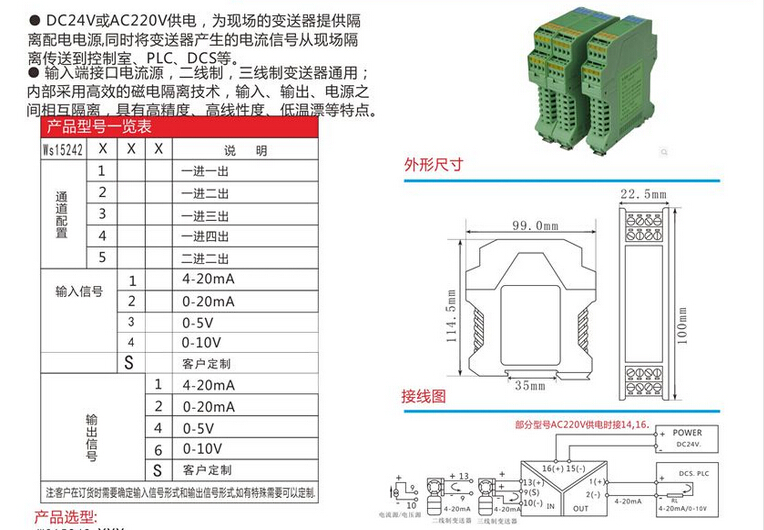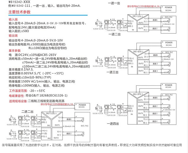 WS15242全隔離雙輸出信號分配器,將輸入信號變換為兩路相互隔離的信號,低功耗,低熱量,低漂移,DIN T型導(dǎo)軌安裝