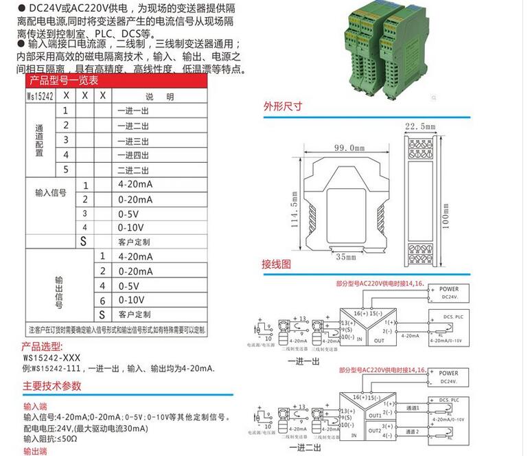 WS15242信號(hào)隔離器 信號(hào)分配器,全隔離輸出信號(hào)分配器 安全隔離柵,信號(hào)隔離器模塊,安全柵,電流轉(zhuǎn)換模塊。將輸入信號(hào)變換為兩路相互隔離的信號(hào),低功耗,低熱量,低漂移,DIN T型導(dǎo)軌安裝