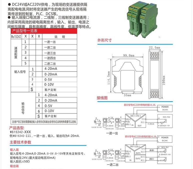 WS15242信號隔離器分配器,全隔離信號調(diào)理模塊,全隔離輸出信號分配器 安全隔離柵,信號隔離器模塊,安全柵,電流轉(zhuǎn)換模塊。將輸入信號變換為兩路相互隔離的信號,低功耗,低熱量,低漂移,DIN T型導(dǎo)軌安裝