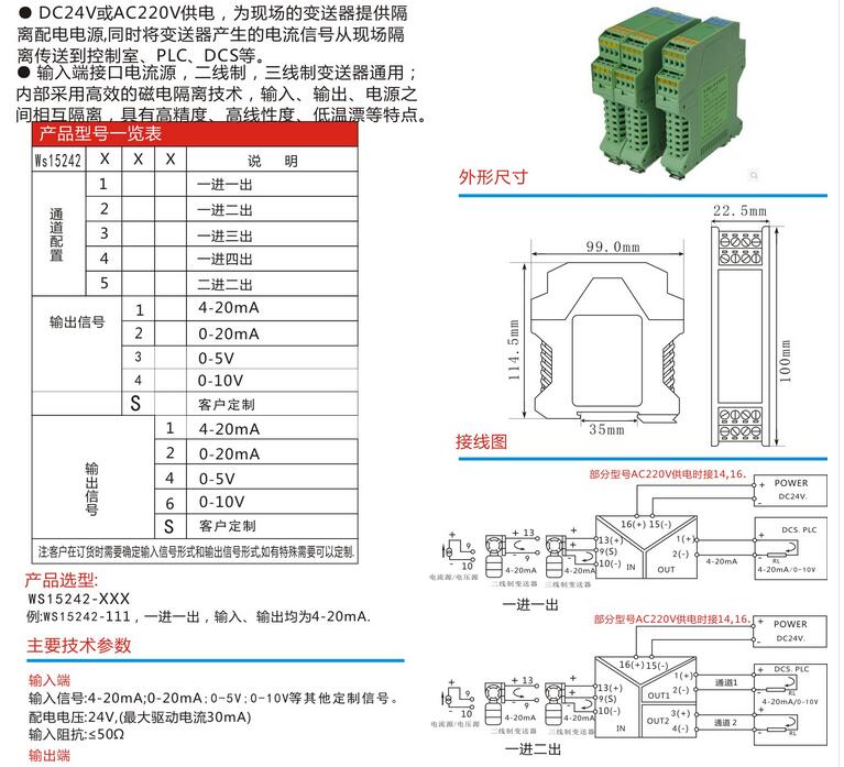 WS15242全隔離雙輸出信號分配器,將輸入信號變換為兩路相互隔離的信號,低功耗,低熱量,低漂移,DIN T型導軌安裝