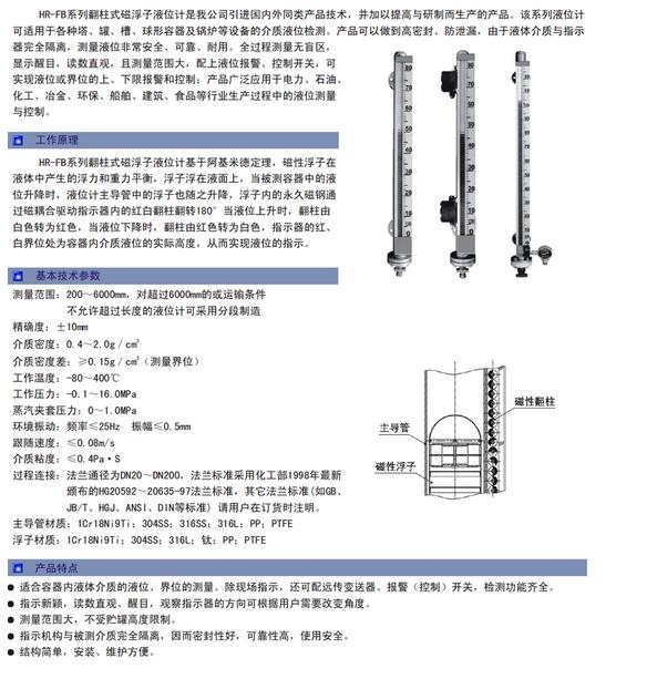 HR-FB系列翻柱式磁浮子液位計(jì)是我公司引進(jìn)國(guó)內(nèi)外同類(lèi)產(chǎn)品技術(shù),并加以提高與研制而生產(chǎn)的產(chǎn)品。該系列液位計(jì)可適用于各種塔、罐、槽、球形容器及鍋爐等設(shè)備的介質(zhì)液位檢測(cè)。
