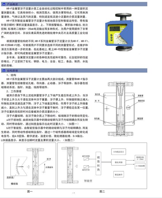 HR-F金屬管浮子流量計是工業(yè)自動化過程控制中常用的一種變面積流量測量儀表。它具有體積小,檢測范圍大,使用方便等特點。它可用來測量液體、氣體以及蒸汽的流量,特別適宜低流速小流量的介質(zhì)流量測量。