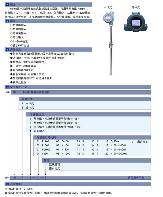 HR-WB是一款現場安裝式智能溫度變送器,可用于熱電阻(RTD)、熱電偶(TC)、電阻(Ω)、電壓(mV)信號輸入,二線制4~20mA輸出,通過HART協議組態(tài),直觀顯示所測溫度值、百分比棒圖、傳感器類型等。