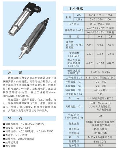 采用高穩(wěn)定性,高準確度隔離金屬膜片的力敏芯片,經(jīng)內(nèi)置存儲器存取傳感器的環(huán)境溫度、壓力及輸入/輸出特性修正參數(shù)、再經(jīng)CPU微處理器運算,進行溫度自動補償,非線性校正、信號放大、V/I轉(zhuǎn)換與A/D轉(zhuǎn)換,輸出4-20mA或0-10mA的標準信號。