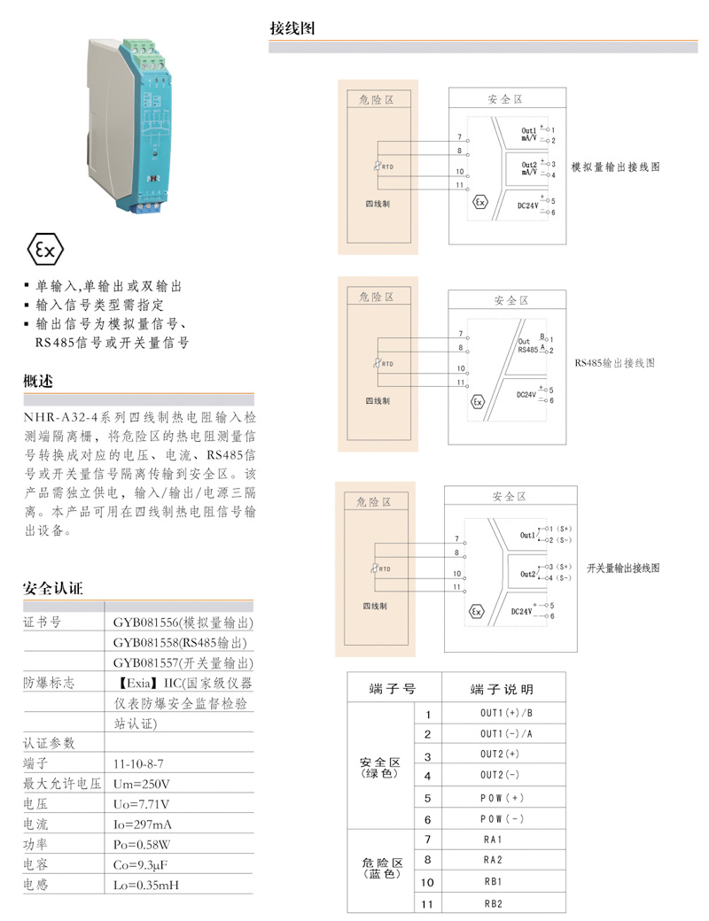 NHR-A32-4四線制熱電阻輸入檢測(cè)端隔離柵,將危險(xiǎn)區(qū)的熱電阻測(cè)量信號(hào)轉(zhuǎn)換成對(duì)應(yīng)的電壓、電流、RS485信號(hào)或開關(guān)量信號(hào)隔離傳輸?shù)桨踩珔^(qū)。該產(chǎn)品需獨(dú)立供電,輸入/輸出/電源三隔離。本產(chǎn)品可用在四線制熱電阻信號(hào)輸出設(shè)備。