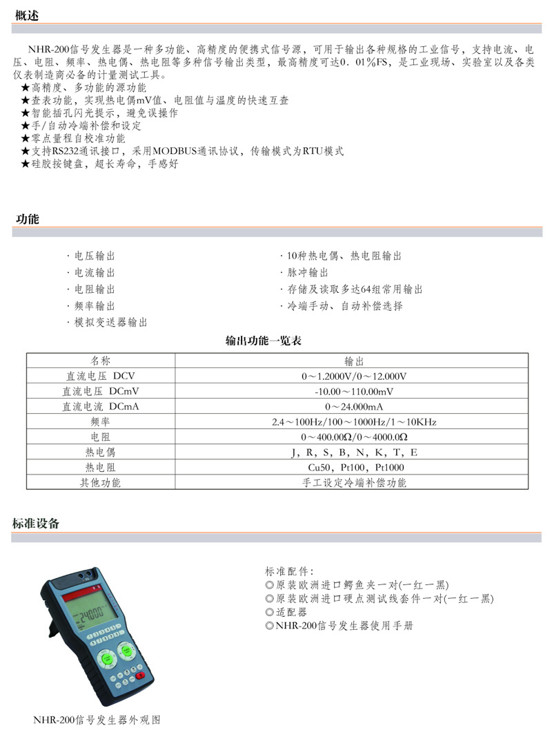 NHR-200信號(hào)發(fā)生器是一種多功能、高精度的便攜式信號(hào)源,可用于輸出各種規(guī)格的工業(yè)信號(hào),支持電流、電壓、電阻、頻率、熱電偶、熱電阻等多種信號(hào)輸出類(lèi)型,最高精度可達(dá)0.01%F.S,是工業(yè)現(xiàn)場(chǎng)、實(shí)驗(yàn)室以及各類(lèi)儀表制造商必備的計(jì)量測(cè)試工具。