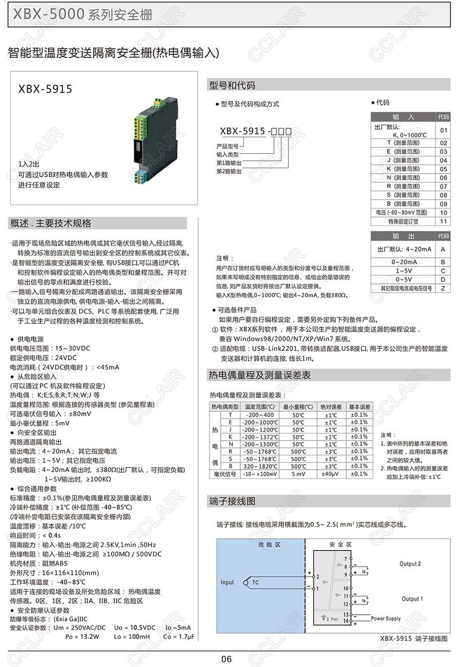 XBX-5915,XCX-5915-02C,XCX-5915-03C,XCX-5915-04C,智能型溫度變送隔離安全柵(熱電偶輸入)(一入二出)