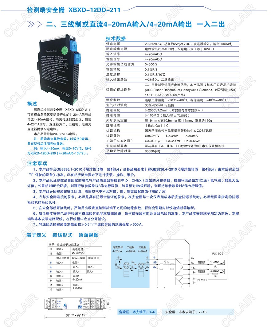 XBXD-12DD-211,XBXD-12DD-299二、三線制或直流4-20mA輸入/4-20mA輸出(一入二出)