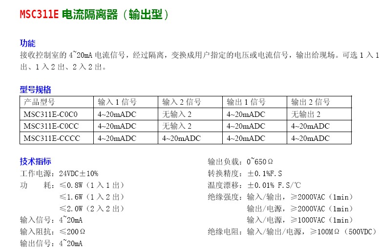 MSC311E-C0C0,MSC311E-C0CC,MSC311E-CCCC,電流隔離器(輸出型)