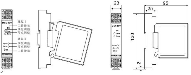 例2:輸入4~20mADC,輸出1為4~20mADC,輸出2為4~20mADC,一入二出,則型號為MSC301-C0CC