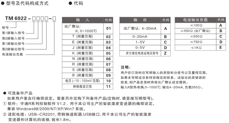 是智能型的溫度變送器, 有 USB 編程接口, 可以使用專用的編程電纜連接這個(gè)溫度變送器和PC機(jī), 通過軟件在PC機(jī)上進(jìn)行編程, 可以任意編程設(shè)定熱電偶分度號和測量溫度的量程范圍。