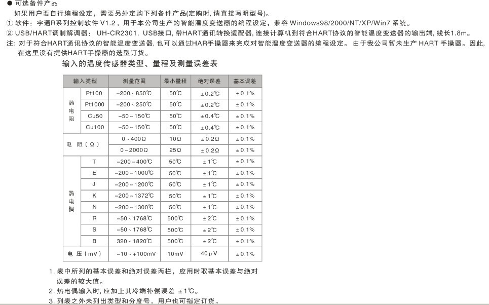 標(biāo)準(zhǔn)精度:±0.1%(參見(jiàn)溫度傳感器類(lèi)型、量程及測(cè)量誤差表)