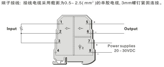 單通道,一入一出。 Pt100,Cu50 等熱電阻輸入。 直流電源供電方式,帶有工作電源指示燈。 輸入-輸出-電源之間隔離。 小體積, 超薄, 殼體厚度僅為6.2 mm。 端子化設(shè)計, 全蔽結(jié)構(gòu), 無需防塵。 螺絲擰緊連接, 接線簡單。 概述 用于Pt100,Cu50 等熱電阻輸入, 經(jīng)隔離變送輸出標(biāo)準(zhǔn)的直流電流或電壓信號。 采用獨立的直流電源供電,供電電源 - 輸入 - 輸出之間隔離。 該隔離器體積小, 超薄, 機殼厚度僅為6.2mm。屏蔽的端子化結(jié)構(gòu)設(shè)計,結(jié)構(gòu)緊湊, 無需防塵,無需散熱。 標(biāo)準(zhǔn)的 35mmDIN 導(dǎo)軌卡式安裝。 該溫度隔離變送器可以與單元組合儀表及 DCS、PLC 等系統(tǒng)配套使用,廣泛用于工業(yè)生產(chǎn)過程的各種溫度檢測。 技術(shù)參數(shù) 輸 入 輸入熱電阻: Pt100;Pt10;Cu50;Cu100等各型熱電阻 允許導(dǎo)線電阻:每條導(dǎo)線≤10Ω 輸 出 輸出電流:4~20mA;0~20mA;0~10mA;其它指定電流 輸出電壓:1~5V;0~5V;0~10V;其它指定電壓 電流輸出負(fù)載:4(0)~20mA輸出時, ≤350Ω(出廠默認(rèn)), 另有 ≤100Ω, ≤550Ω,≤750Ω,≤1KΩ 可選 電壓輸出負(fù)載:1(0)~5V輸出時, ≥10KΩ 輸出紋波: < 10mVp-p 綜合通用參數(shù) 供電電壓范圍:20~30VDC 額定供電電壓:24VDC 電流消耗 (24VDC供電時):< 30mA 標(biāo)準(zhǔn)精度:±0.1% (參見熱電阻類型、量程及測量誤差表) 溫度漂移:基本誤差 /10℃ 響應(yīng)時間:< 10ms 穩(wěn)定時間:< 3s 隔離能力:輸入-輸出-電源之間 2.5KV,1min ,50Hz 絕緣電阻:輸入-輸出-電源之間 ≥100MΩ / 500VDC 工作環(huán)境溫度:-20~+60℃ 儲存環(huán)境溫度:-40~+80℃ 環(huán)境濕度范圍: 5~95%(無冷疑) 電磁兼容:符合 89 / 336 / EEC , IEC/EN 61000 機殼材質(zhì):PC(聚碳酸脂)材料 防護(hù)等級:IP 20 外形尺寸:6.2×84×100(mm) 重量: 約 50 克 選型、訂貨代碼 ![]() 端子接線圖