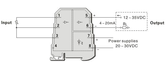 用于Pt100,Cu50 等熱電阻輸入, 經(jīng)隔離變送輸出標(biāo)準(zhǔn)的直流電流信號(hào)4~20mA。