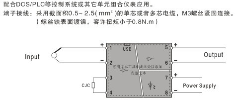 熱電偶或毫伏信號(hào)輸入,經(jīng)過隔離變送輸出標(biāo)準(zhǔn)的直流信號(hào)至控制系統(tǒng)或其它單元組合儀表。
