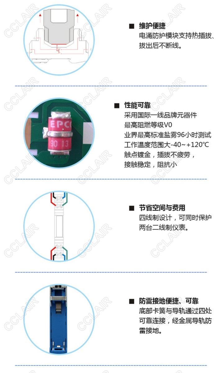 24V信號(hào)SPD,四線制,本安型,適用于線對(duì)地隔離電壓>500V信號(hào)回路,最大放電電流Imax(8/20us):20kA/線,12.5mm超薄,通過(guò)DIN35金屬導(dǎo)軌接地。
