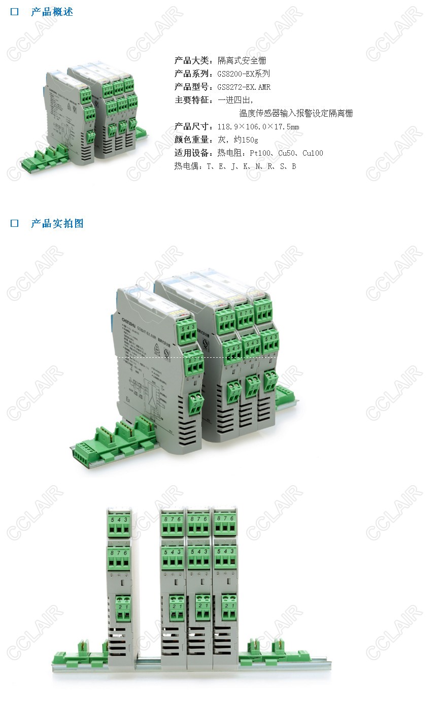 溫度傳感器輸入,4~20mA、繼電器、RS485輸出報(bào)警設(shè)定隔離柵。將危險(xiǎn)側(cè)的熱電阻、熱電偶信號轉(zhuǎn)換成4~20mA標(biāo)準(zhǔn)電流信號傳輸?shù)桨踩珎?cè)輸出。它具有報(bào)警設(shè)定功能和RS485通訊功能,可以通過MODBUS-RTU協(xié)議組成網(wǎng)絡(luò)。通訊接口必須采用導(dǎo)軌連接方式,電源可選擇導(dǎo)軌或端子連接方式。