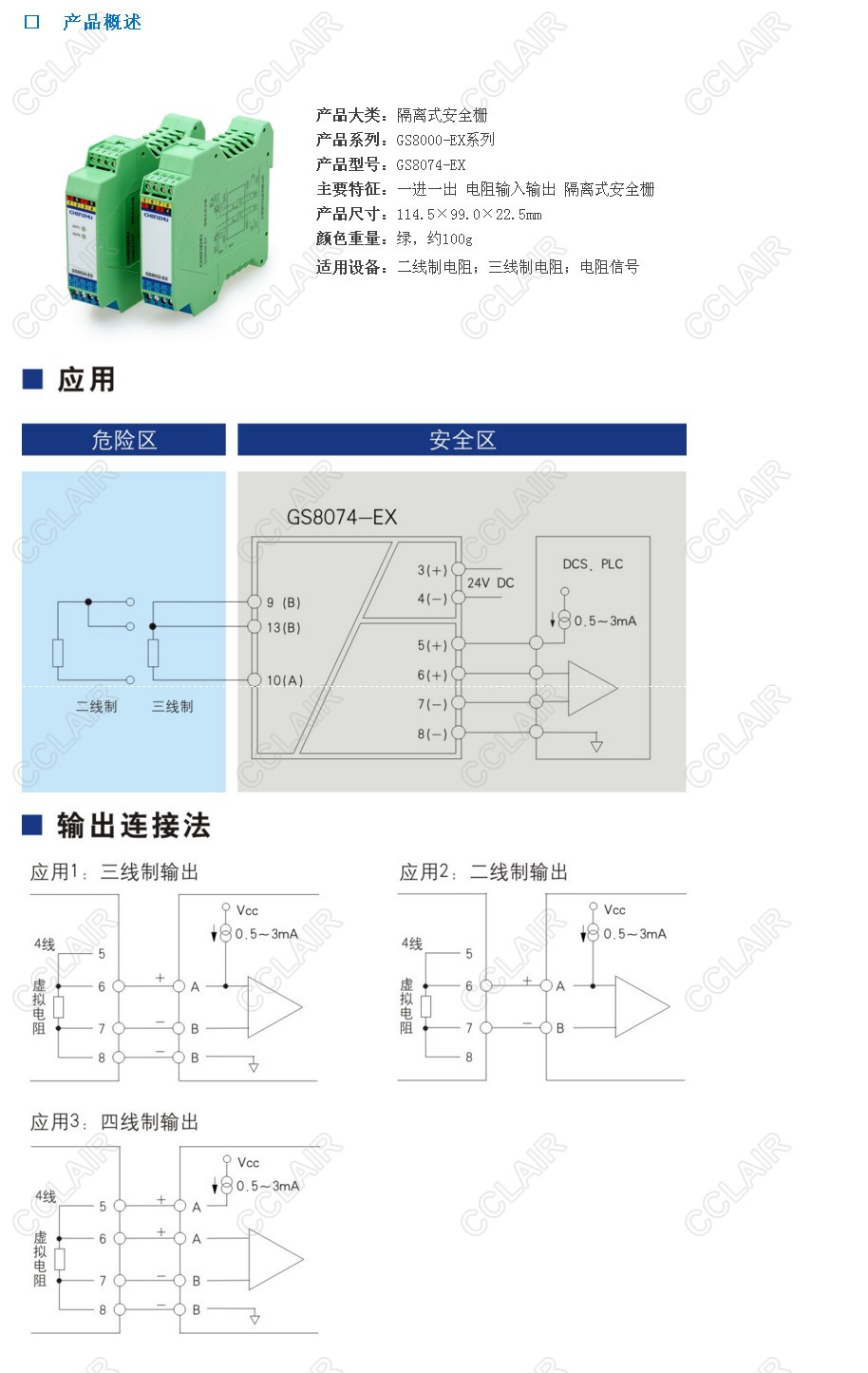 電阻輸入、電阻輸出隔離式安全柵,將現(xiàn)場(chǎng)二線制、三線制電阻信號(hào)1:1隔離傳輸?shù)桨踩珎?cè)輸出。該產(chǎn)品需要獨(dú)立供電,電源、輸入和輸出三隔離。