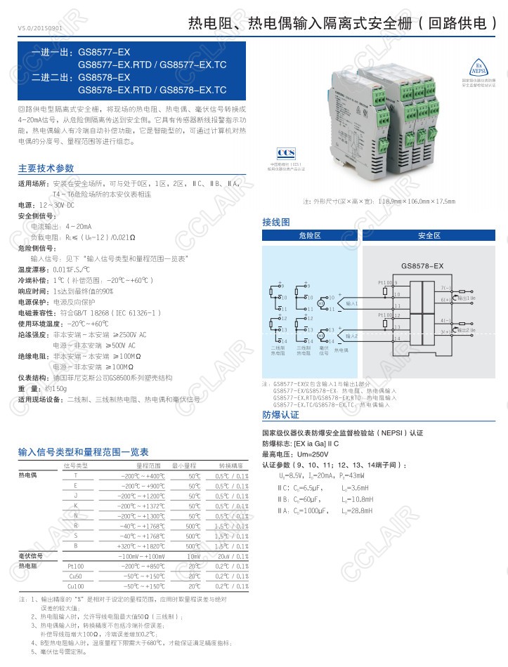 型號(hào): GS8577-EX.TC 一進(jìn)一出 熱電偶、毫伏信號(hào)輸入隔離式安全柵(回路供電)