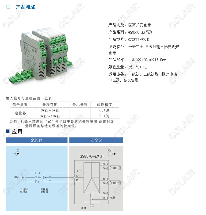 隔離式安全柵,將現(xiàn)場的熱電阻、熱電偶、毫伏信號、電位器信號轉(zhuǎn)換成0/4~20mA的電流信號或0~5V電壓信號,從危險區(qū)隔離傳送到安全區(qū)。它具有冷端補償功能,是智能型的,可通過計算機對熱電阻、熱電偶、電位器的分度號、量程范圍等進行組態(tài)。該產(chǎn)品需要獨立供電,電源、輸入和輸出的三隔離。
