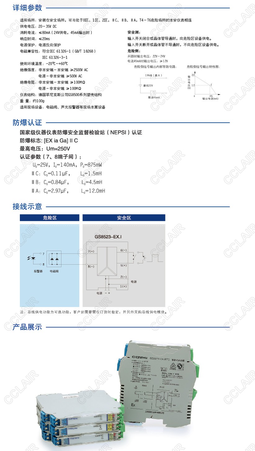 12V/45mA驅(qū)動(dòng),開(kāi)關(guān)量輸出,通過(guò)安全區(qū)的開(kāi)關(guān)控制或邏輯電平信號(hào)控制,驅(qū)動(dòng)危險(xiǎn)區(qū)的現(xiàn)場(chǎng)本安設(shè)備,需獨(dú)立供電,電源、輸入和輸出三隔離。