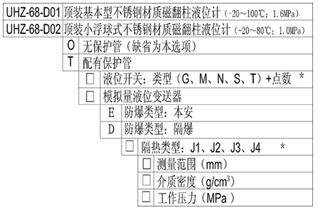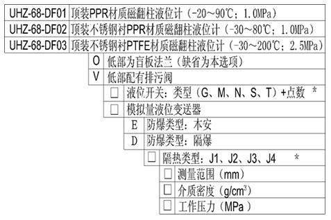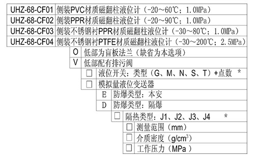 UHZ-68-CF01/CF02/CF03/CF04為四種側(cè)裝式防腐型磁翻柱液位計(jì),CF01的材質(zhì)為加強(qiáng)型PVC,主 要特 點(diǎn)是經(jīng)濟(jì)實(shí)用,缺點(diǎn)是易老化,不易在露天環(huán)境下使用;CF02的材質(zhì)為PPR,可以用于一般場(chǎng)合的 防腐使 用;CF03的材質(zhì)為不銹鋼內(nèi)襯PPR,強(qiáng)度和使用壽命較CF02型均有提高; CF04的材質(zhì)為不銹鋼 內(nèi)襯PTFE, 主要特點(diǎn)是具有較高的耐腐蝕的性能和優(yōu)秀的耐溫、承壓性能。