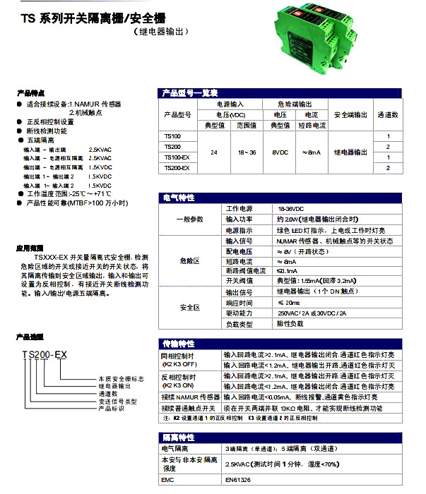 | TS200-EX | 開關(guān)量檢測(cè)端隔離式安全柵 | NAMUR傳感器、機(jī)械觸點(diǎn)等開關(guān)狀態(tài) | 繼電器輸出 | 2進(jìn)2出 | 五端隔離; 正反相控制設(shè)置 斷線檢測(cè)功能 |
