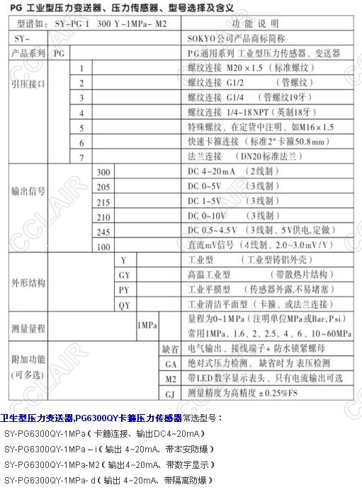 SY-PG6300QY-1MPa(卡箍連接、輸出DC4~20mA) SY-PG6300QY-1MPa-i(輸出 4~20mA、帶本安防爆) SY-PG6300QY-1MPa-M2(輸出4~20mA、帶數(shù)字顯示) SY-PG6300QY-1MPa- d(輸出 4~20mA、帶隔離防爆)