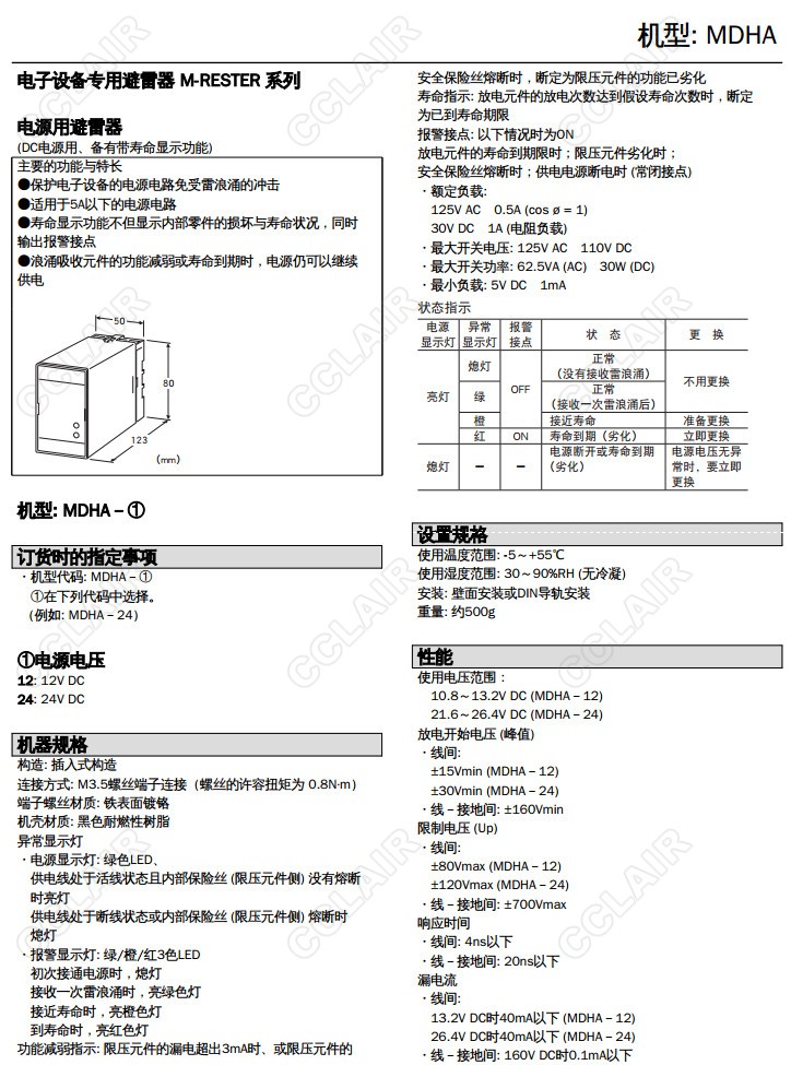 MDHA-12/MDHA-24,直流電源用 最大負(fù)載5A 插入型 壽命顯示功能避雷器
