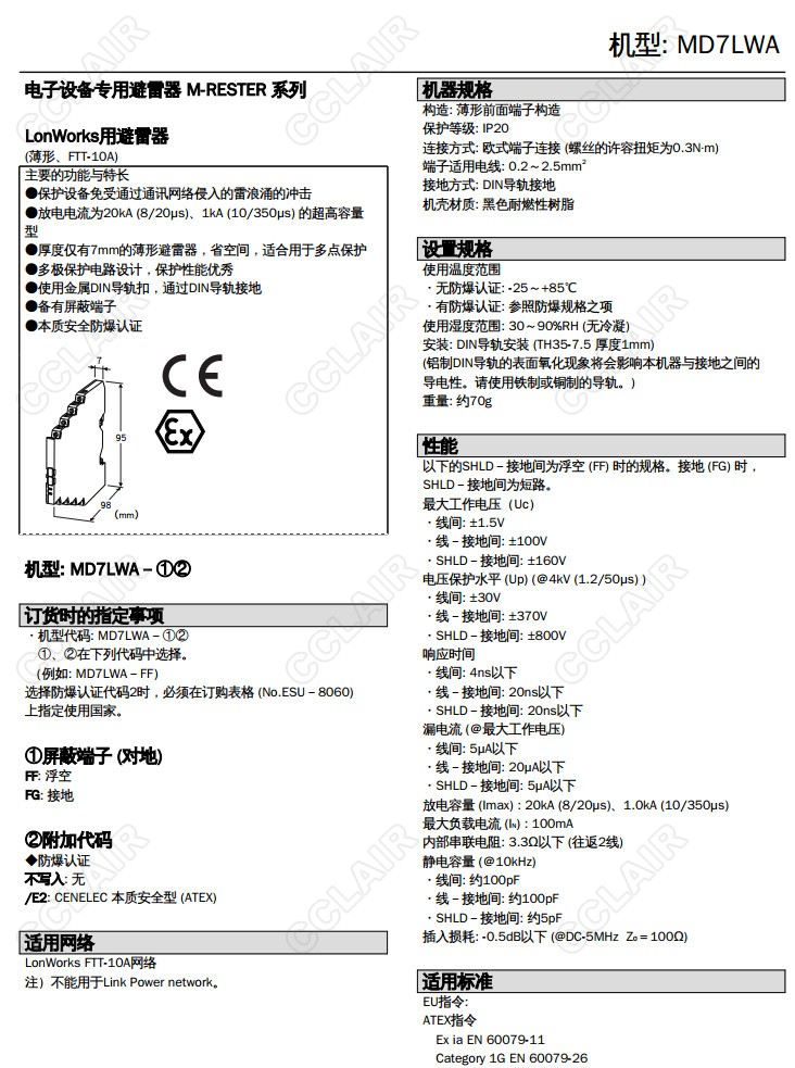 MD7LWA,MD7LWA-FF,MD7LWA-FG,MD7LWA-FF/E2,MD7LWA-FG/E2, LONWORKS(FTT-10A)用 超薄型避雷器