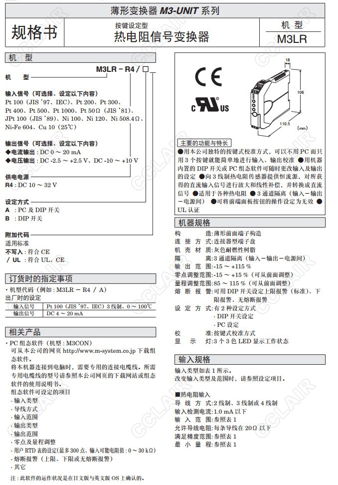 M3LR,M3LR-R4/A,M3LR-R4/B,M3LR-R4/A/UL,M3LR-R4/B/UL,熱電阻信號變換器(按鍵設定型)