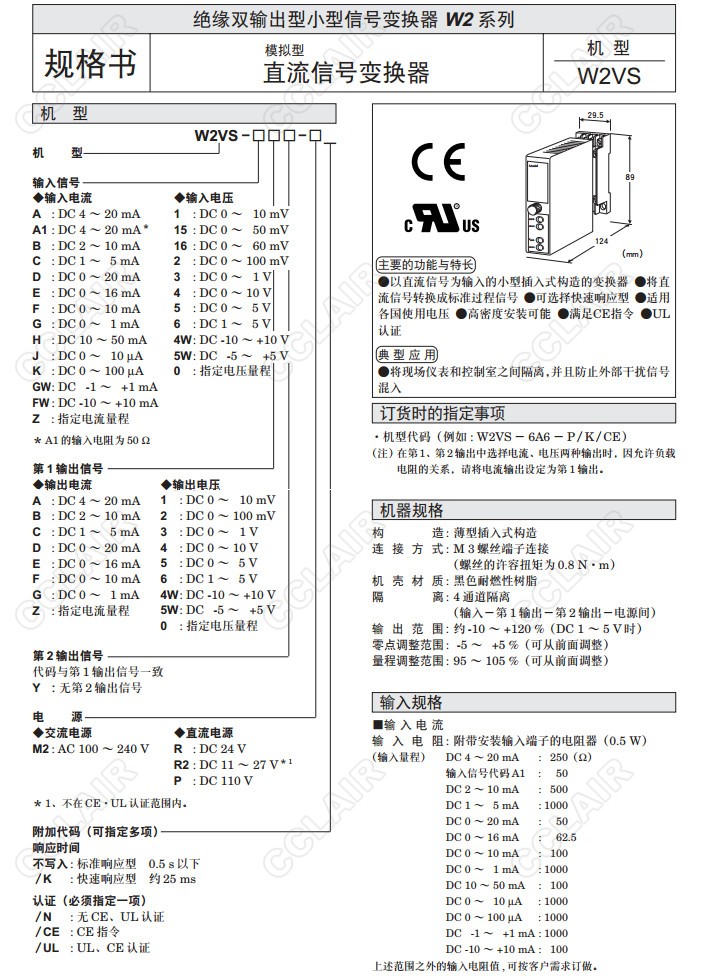 W2VS,W2VS-6A6-P/K/CE,W2VS-A,W2VS-A1,W2VS-B,W2VS-C,W2VS-D,W2VS-E,直流信號變換器(模擬型)