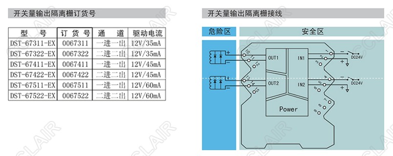 DST-67000系列12V驅(qū)動,開關(guān)量輸出隔離柵將安全區(qū)的電源通過開關(guān)控制,驅(qū)動危險區(qū)的現(xiàn)場本安設(shè)備,它允 許控制開關(guān)直接連接到24V供電回路的任一端。本產(chǎn)品適用于驅(qū)動如電磁閥、聲光報警等本安設(shè)備。