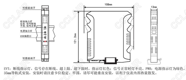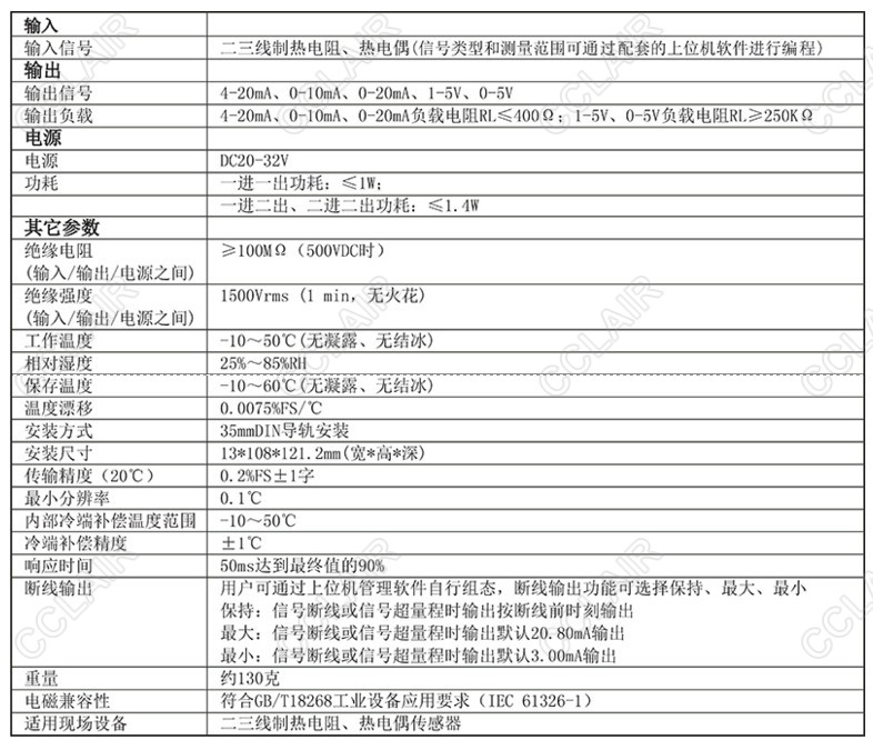 DST-81500系列薄型溫度變送隔離器將現(xiàn)場的熱電阻或熱電偶信號(hào)經(jīng)過隔離放大處理,轉(zhuǎn)換為與溫度成線性的 直流信號(hào)輸出至控制系統(tǒng),用作熱電偶溫度變送時(shí),具有冷端溫度自動(dòng)補(bǔ)償功能。可用配套的上位機(jī)軟件進(jìn)行參數(shù) 修改,可以與單元組合儀表及DCS、PLC等系統(tǒng)配套使用,給予現(xiàn)場儀表信號(hào)隔離、信號(hào)轉(zhuǎn)換、信號(hào)分配、信號(hào)處理 等,從而提高工業(yè)生產(chǎn)過程自動(dòng)控制系統(tǒng)的抗干擾能力,保證系統(tǒng)的穩(wěn)定性和可靠性。本產(chǎn)品品種分為一進(jìn)一出、 一進(jìn)二出、二進(jìn)二出,且輸入、輸出磁隔離。