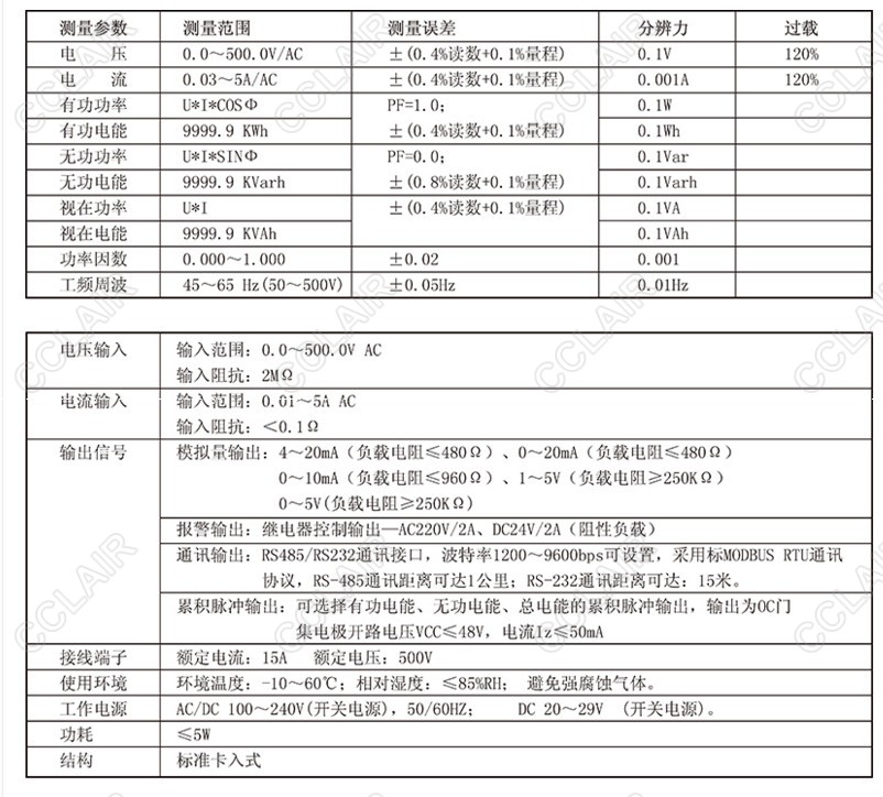 DST-13100系列單相電量表可外接電壓、電流互感器的標(biāo)準(zhǔn)信號(hào)或直接接入電流5A、電壓500V的交流信號(hào), 并通過專用的電量計(jì)量芯片可測量有功功率、三相有功平衡功率、無功功率、視在功率、功率因數(shù)、工頻周波 、有功電能、無功電能和總電能,并在型號(hào)上對(duì)每個(gè)功能做了明確的細(xì)分。輸出功能可選模擬量輸出、通訊輸 出和累積脈沖輸出功能,配備RS232/485通訊接口,支持標(biāo)準(zhǔn)MODBUS RTU通訊協(xié)議,可組網(wǎng)實(shí)現(xiàn)數(shù)據(jù)的集中管理 ;可帶欠壓和過載事件報(bào)警功能。 本產(chǎn)品采用工業(yè)級(jí)元器件,所有與外界的連接都做了電氣隔離,內(nèi)置抗雷擊保護(hù)電路和電源濾波器。可靠的 端子輸入,接線端子采用國外進(jìn)口插拔式端子,具備高耐壓和過流等級(jí)的特點(diǎn)。專業(yè)的EMC設(shè)計(jì),對(duì)裝置輸入電 源、模擬和數(shù)字電源進(jìn)行實(shí)時(shí)的監(jiān)測,保證了其運(yùn)行的可靠性。科學(xué)的自診斷功能,可通過顯示代碼表明產(chǎn)品 的故障。適用于成套智能高、低壓配電柜、智能箱變、小家電性能檢測系統(tǒng)的數(shù)據(jù)采集。