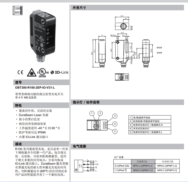 OBT300-R100-2EP-IO-V31-L,漫反射型傳感器