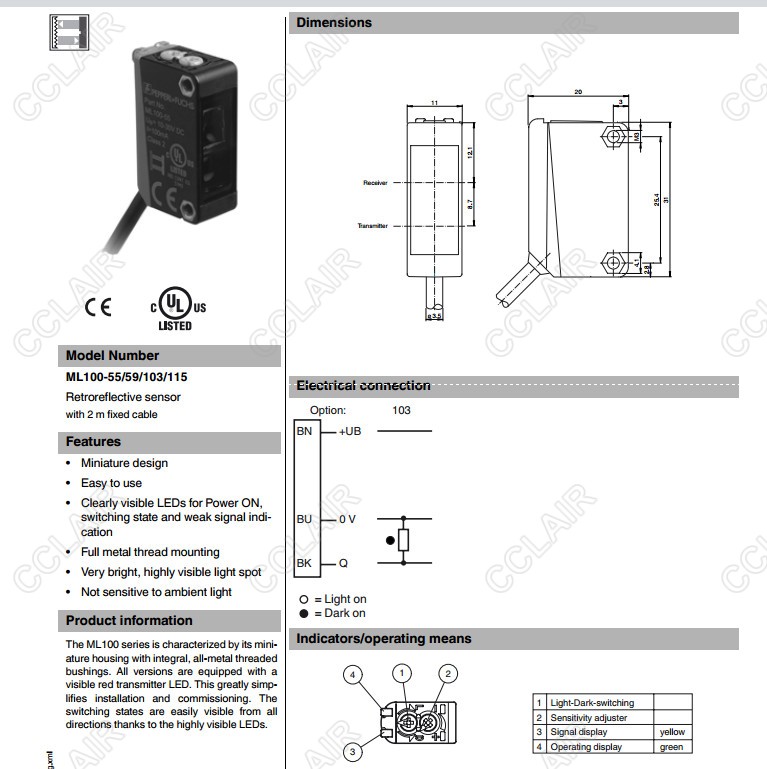 ML100-55/33/103/115-5M,ML100-55/59/103/115,反射板型傳感器