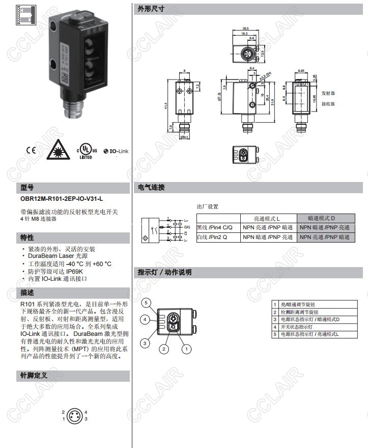 OBR12M-R101-2EP-IO-V31-L,反射板型傳感器