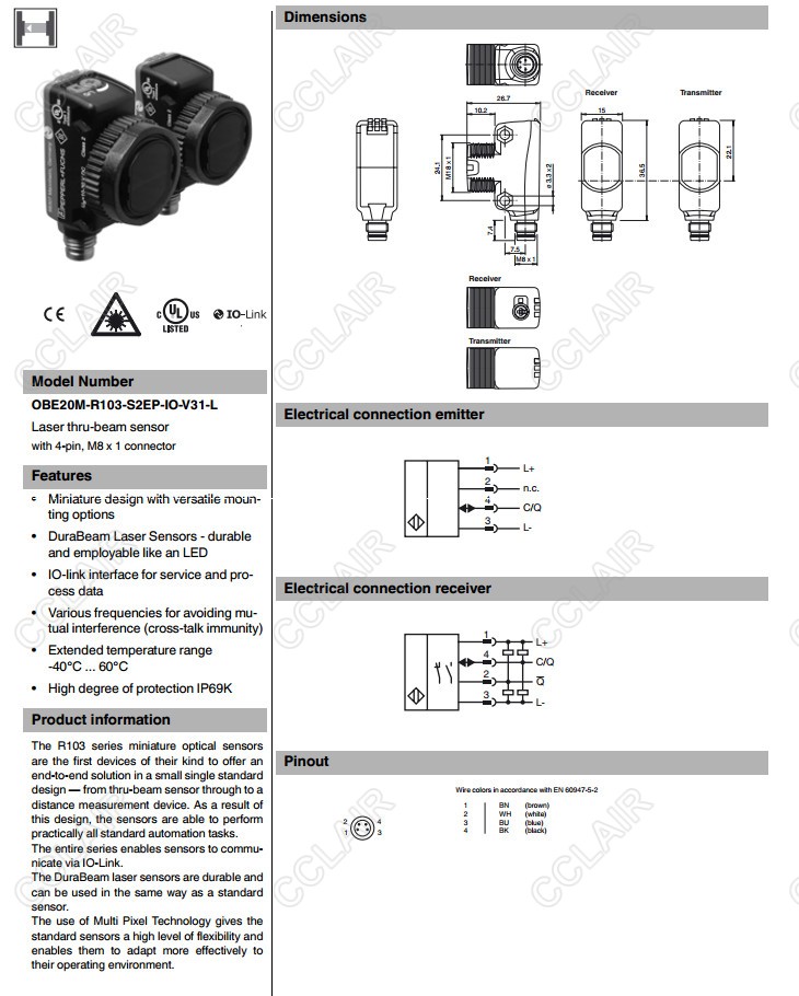 OBE20M-R103-S2EP-IO-V31-L,OBE20M-R103-SEP-IO-V3-L,激光對射傳感器