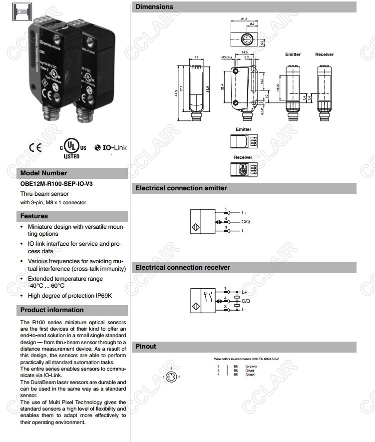 OBE12M-R100-SEP-IO-V3,對(duì)射型傳感器