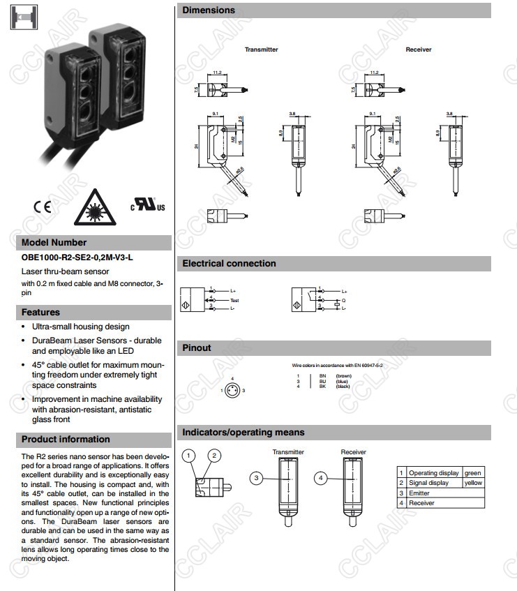 OBE1000-R2-SE2-0,2M-V3-L,OBE1000-R2-SE2-0,2M-V31-L,激光對(duì)射傳感器