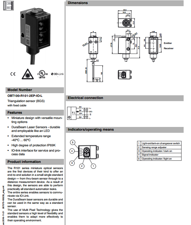 OBT100-R101-2EP-IO-L,漫反射型傳感器