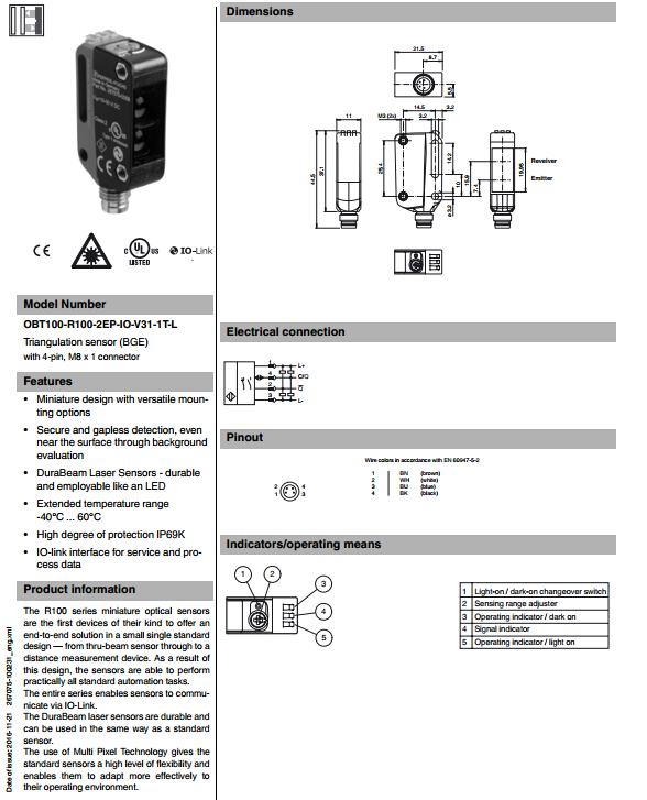 OBT100-R100-2EP-IO-V31-1T-L,漫反射型傳感