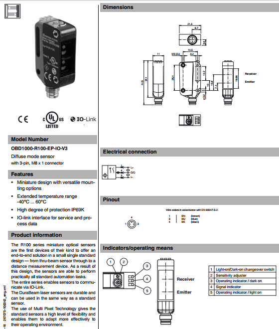 OBD1000-R100-EP-IO-0,3M-V3,漫反射型傳感